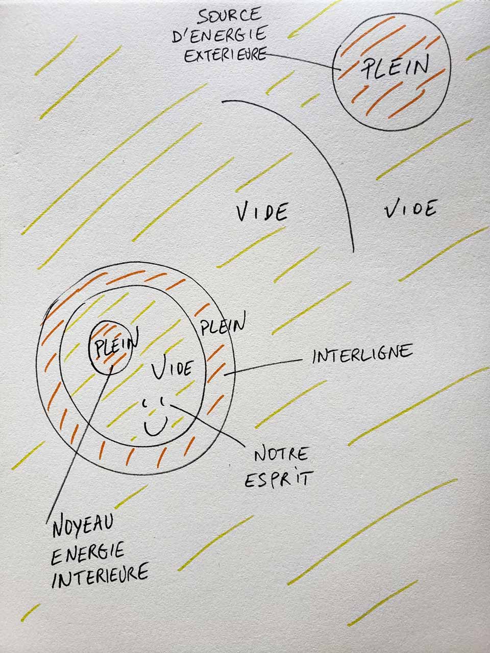 En partant du concept que des zones de vide et de plein délimitées par des interlignes nous composent. Ces vides sont en fait pleins d’énergies, et ces pleins ne sont qu’énergies.